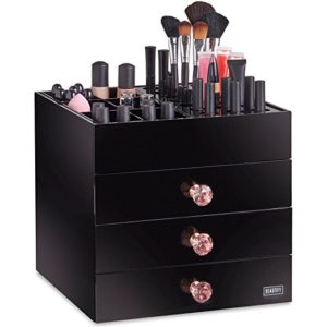 This large cosmetic organizer holds a variety of items, including makeup brushes, lipstick, pencils and it has three drawers. I love the rose gold handles, which make me think of old Hollywood glamor.