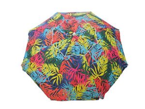 We love the tropical print of this 7 foot beach umbrella. This one also has the sand screw attached to its pole, and comes with a travel bag.