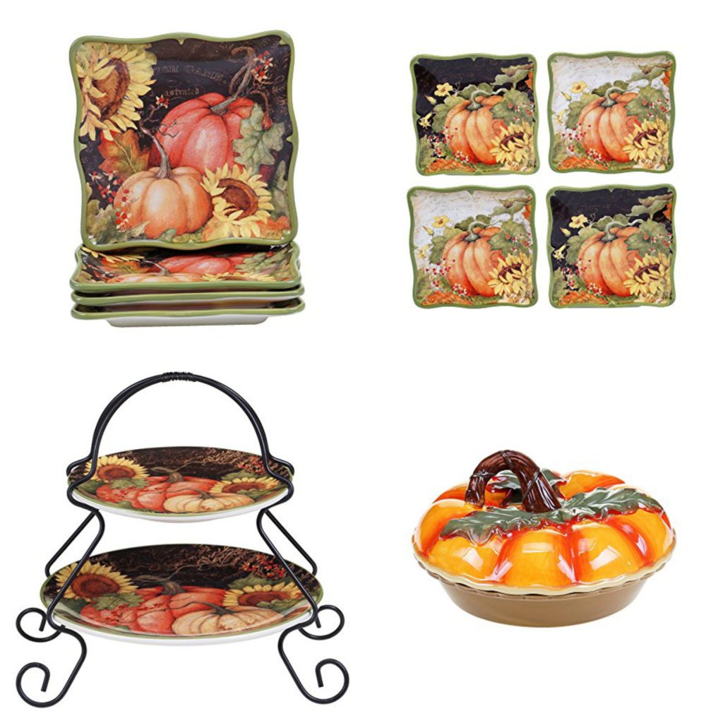 The two-tier server has a 7-inch and 9-inch plate included. These dessert plates come in a set of four, and there are four, 10.5-inch square dinner plates as well. The 3-D pumpkin platter is an ideal choice for a festive table this Fall. I can’t wait to use these at my next family gathering!