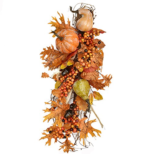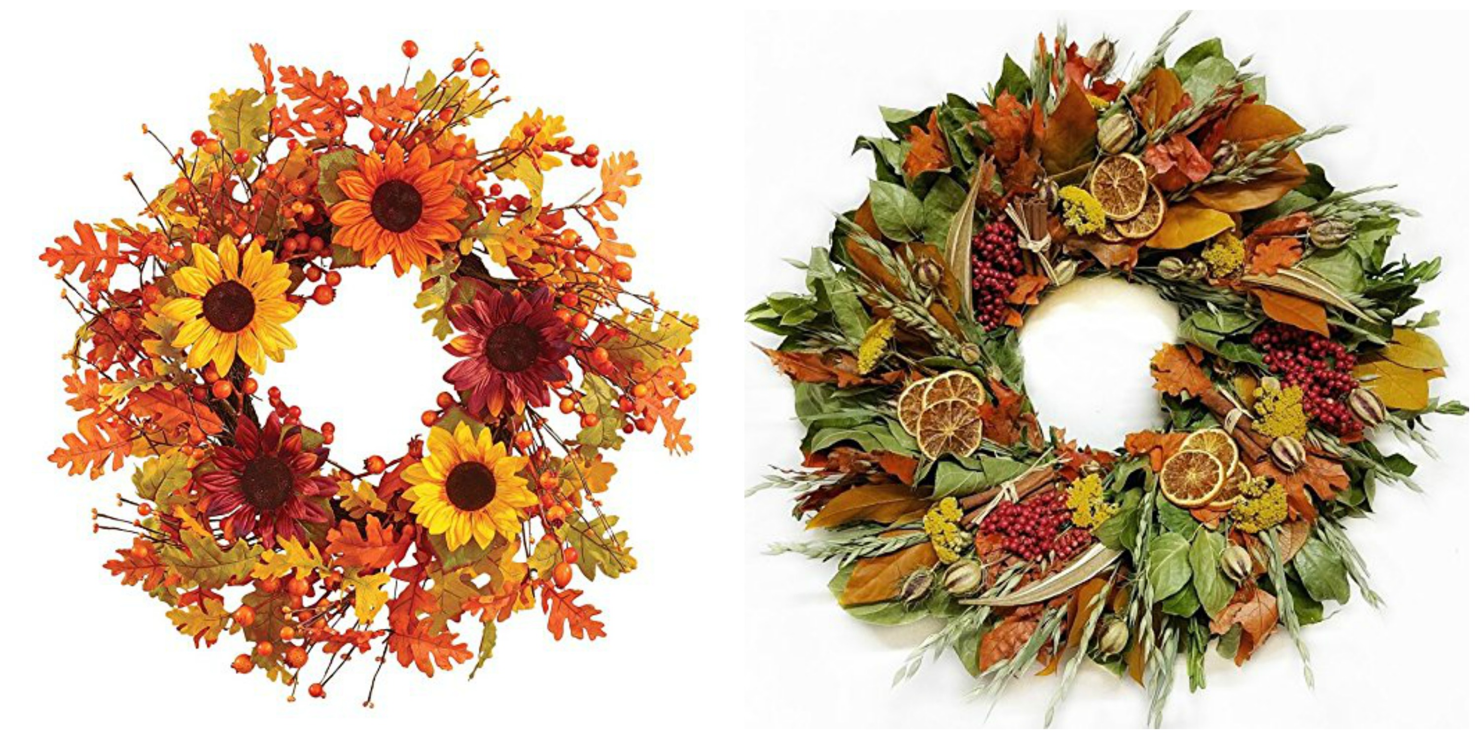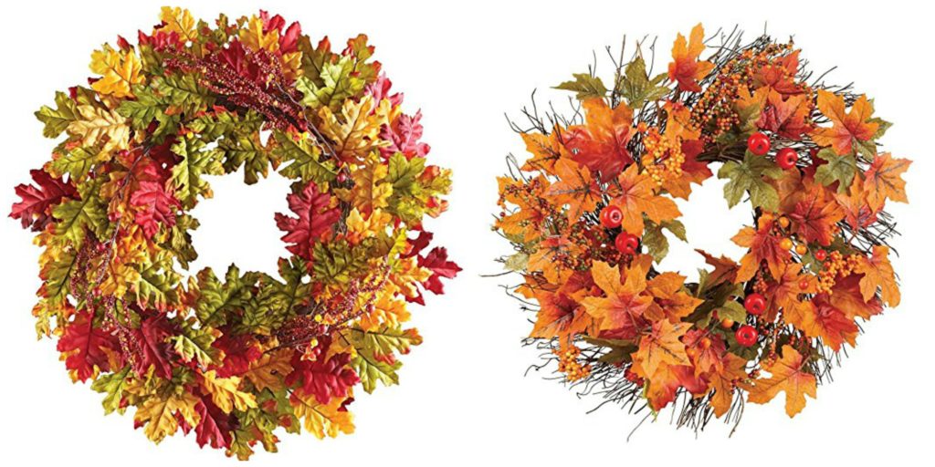 Here is the oak leaves and berries Fall harvest wreath, if pumpkins and gourds aren’t your thing. Pictured on the right is the berry and autumn leaves wreath in the perfect orange hue. Both are made by Collections Etc.